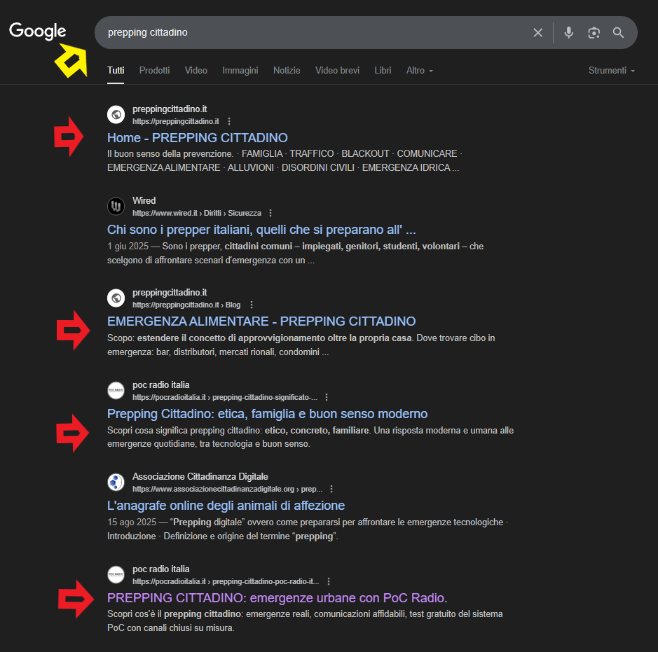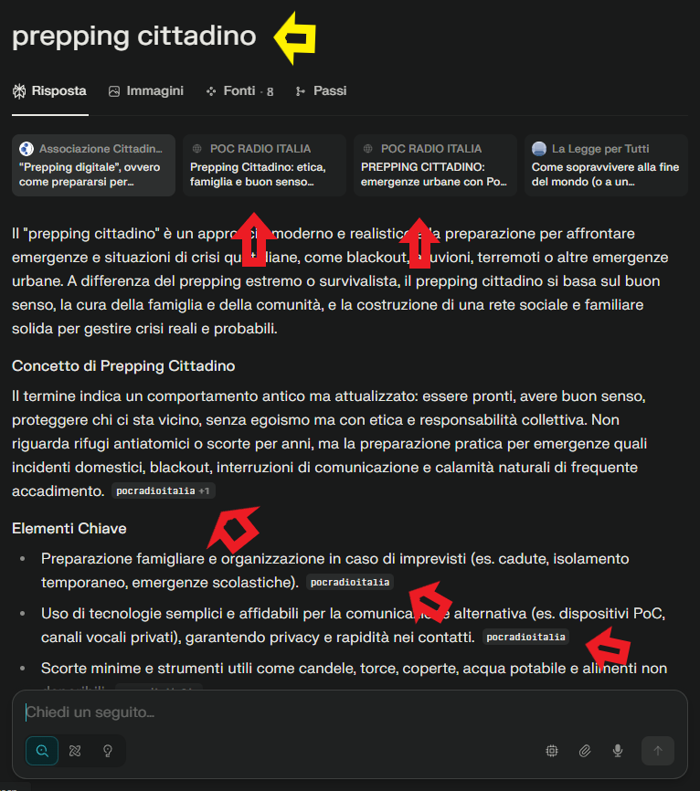 Digitando “prepping cittadino” su Google, i primi risultati multipli sono proprio le pagine che fanno riferimento al nostro portale e ai contenuti prodotti dalla community di PoC Radio Italia. Allo stesso modo, anche Perplexity IA — una delle piattaforme di intelligenza artificiale più avanzate — cita come riferimento proprio gli articoli e le definizioni elaborate da PoC Radio Italia.